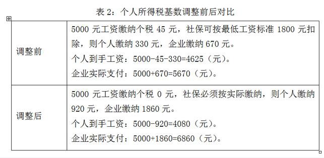 對比結(jié)論:上調(diào)個(gè)稅基數(shù)后,個(gè)人實(shí)際收入減少,4080元<4625元;企業(yè)實(shí)際負(fù)擔(dān)增加,6860元>5670元。