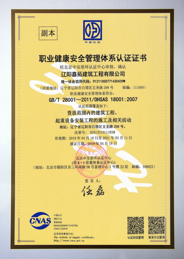 職業(yè)健康安全管理體系認證證書